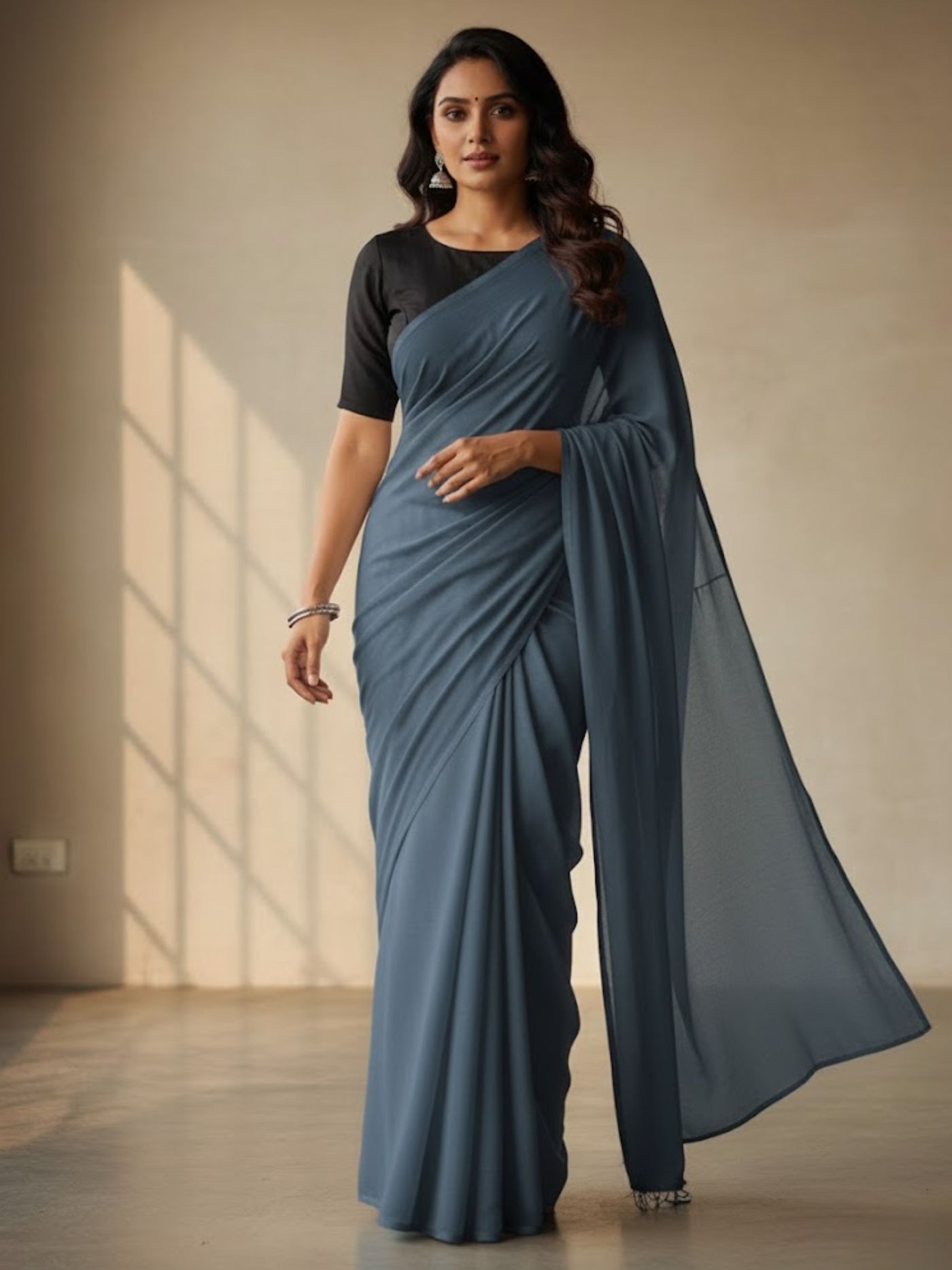 A timeless design that radiates effortless elegance for any occasion. Crafted from premium georgette, this saree offers durability with a lightweight, flowing texture—perfect for all-day comfort. Designed for easy, one-minute draping, it’s ideal for casual gatherings and formal events alike, blending simplicity with sophistication. This versatile classic is a chic and dependable addition to your wardrobe, adding a modern twist to a traditional favorite.